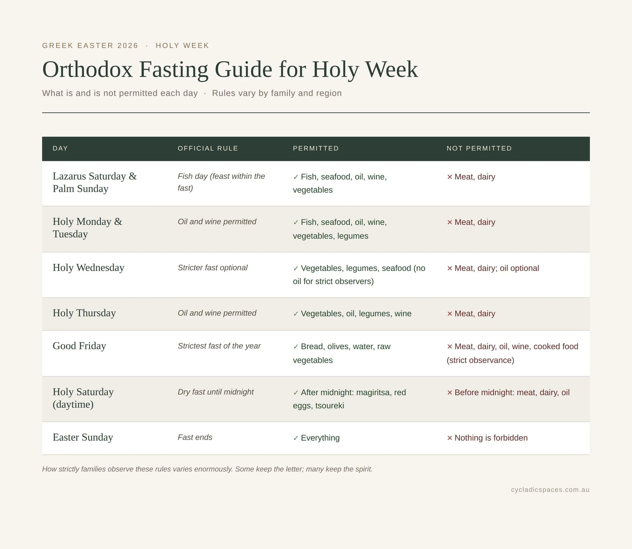 The full guide to Greek Easter 2026 dates, meaning, and what to expect is in our Greek Easter 2026 traditions guide. The deep-dive into Lazarus Saturday and Palm Sunday is in its own piece. This is the practical one. The schedule that helps you know what is coming and how to cook for it.