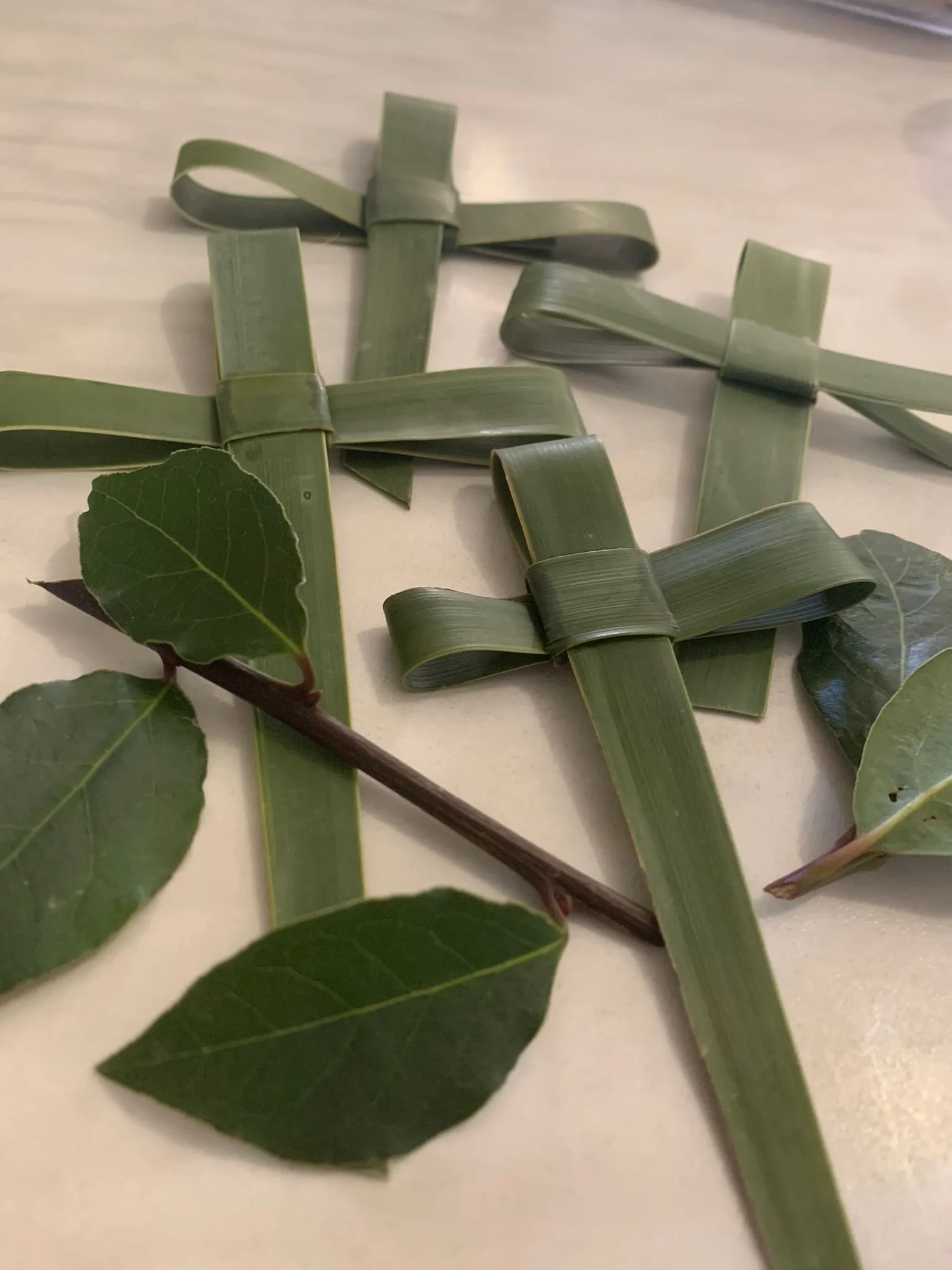 Church service Divine Liturgy, usually beginning around 8–9am. Attend the service and collect your palm cross. a small cross woven from palm leaves, blessed during the liturgy and distributed to the congregation. Take it home and put it near an icon or above the front door.