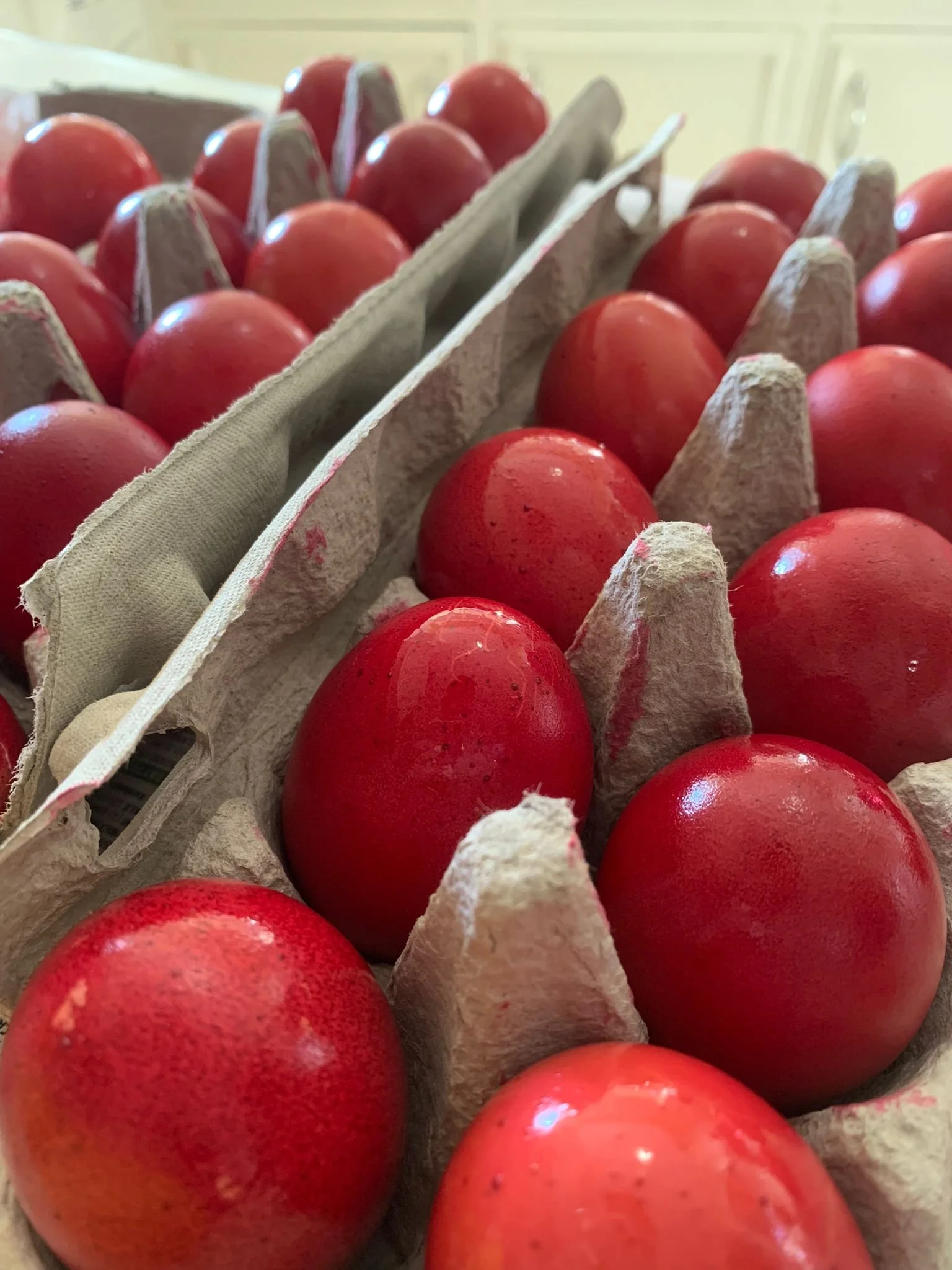 Eggs are dyed red on Holy Thursday. the colour symbolises the blood of Christ and the red eggs represent new life. They are cracked against each other in a game called tsougrisma. Two people tap eggs pointed end to pointed end, the cracked egg loses, the survivor plays on. It is competitive and taken seriously by children across the country.