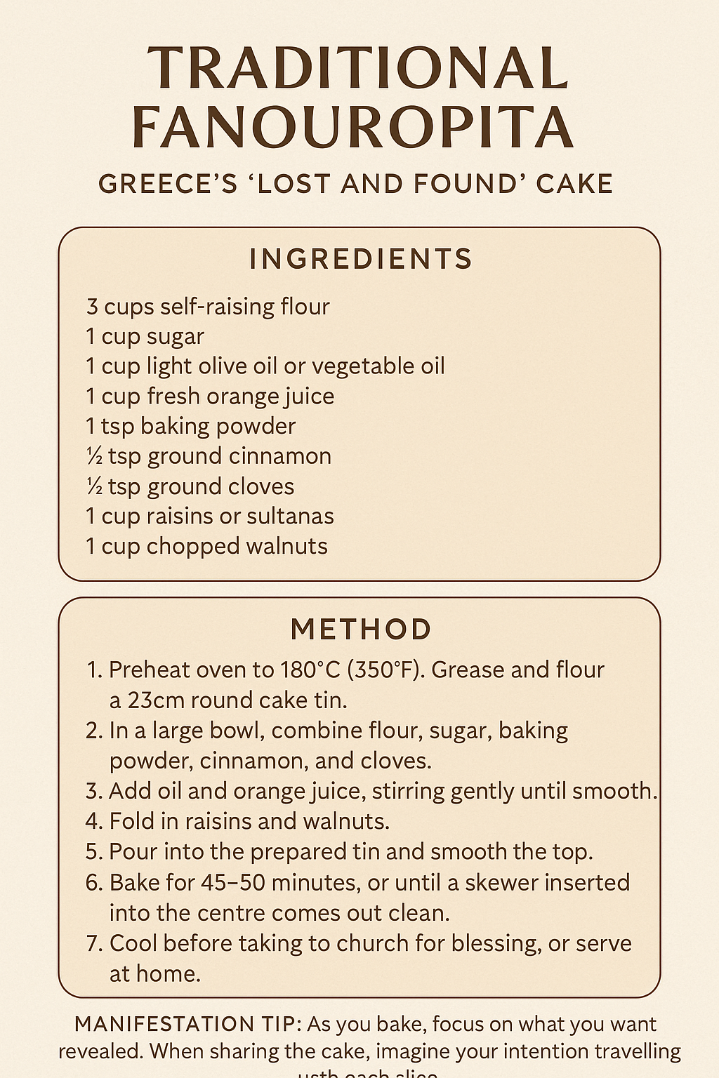 Baking Fanouropita is not just about mixing flour and sugar. The process itself is a spiritual act. As you measure, stir, and fold the ingredients, you speak quietly to St Fanourios, sharing what you hope to find. For some, it is the return of a lost item. For others, it is courage, clarity, or the next step in a new chapter. Every movement in the kitchen becomes a form of prayer or meditation.
