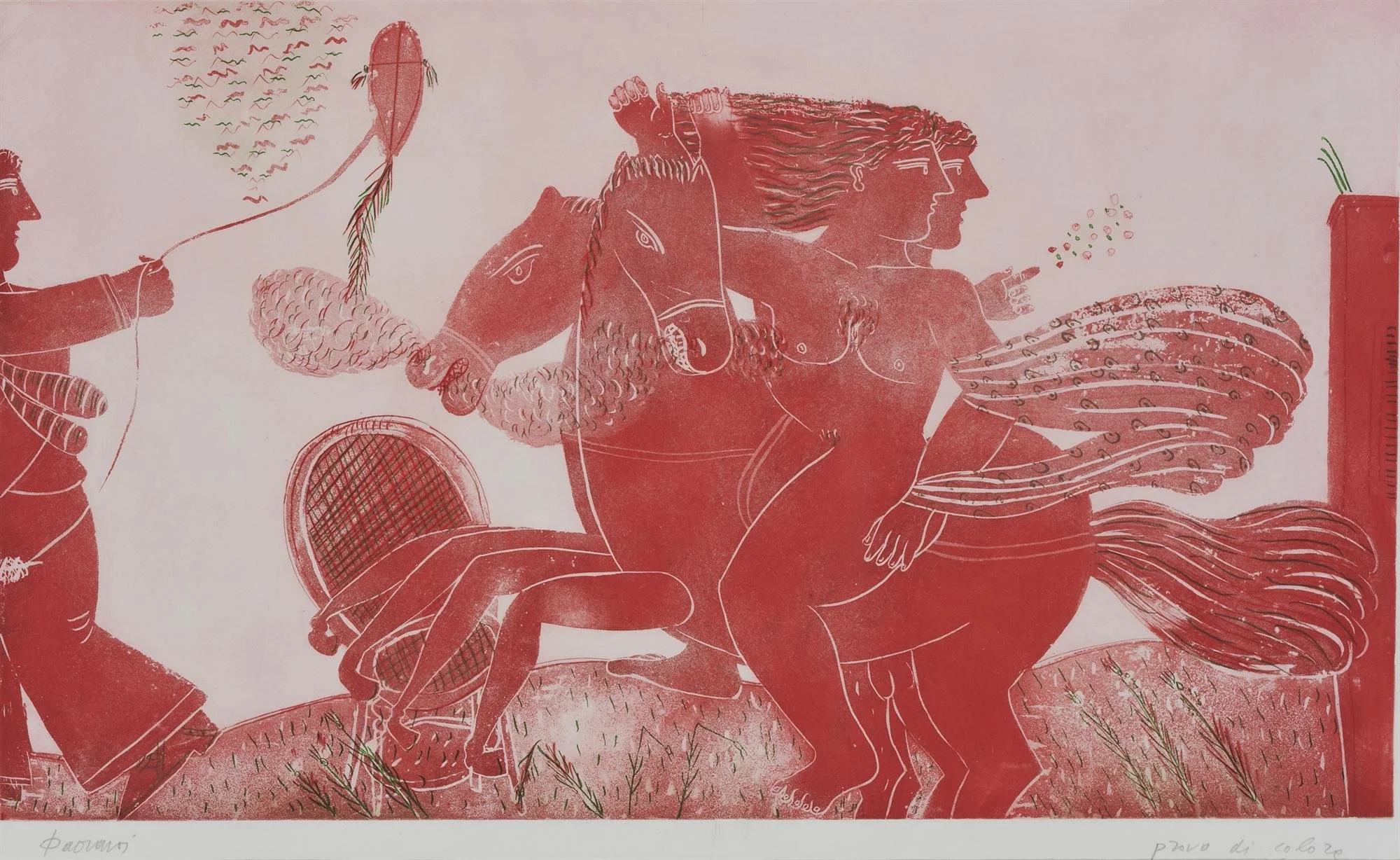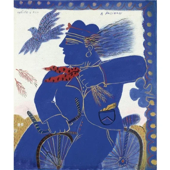 The bicycle rider, the smoker, couples in profile, birds in flight, and mythological figures are the recurring symbols in Alekos Fassianos paintings. His figures are typically flat, outlined in warm tones, and set against rich Mediterranean palettes of blue, ochre, terracotta, and gold.